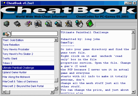 A Cheat-Code Tracker with Hints for several popular PC Action and Adventure Games. 101 Games are represented in this new version from Strategy Games, Adventure Games to Action Games. This Database represents all genres and focuses on recent releases. Games are listed alphabetically in the left-hand window. When you highlight a game, the relevant cheat is displayed in the right-hand window, with convenient buttons that let you print the selection or save any changes you've made.If you need help with the latest and greatest games, CheatBook should be a big help. (Win95/98/NT)(Install/Uninstall) -[Freeware]-